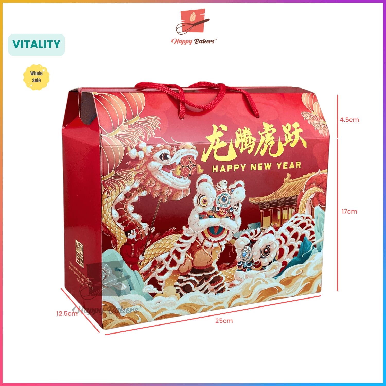 This gift box is suitable for packaging cookies, cakes, snacks, and small festive gifts. It comes in five unique Chinese New Year-inspired designs—Happiness, Fortune, Prosperity, Vitality, and Lunar—allowing you to match different gifting themes. The gold stamping detail adds visual appeal while maintaining a compact, easy-to-handle structure.